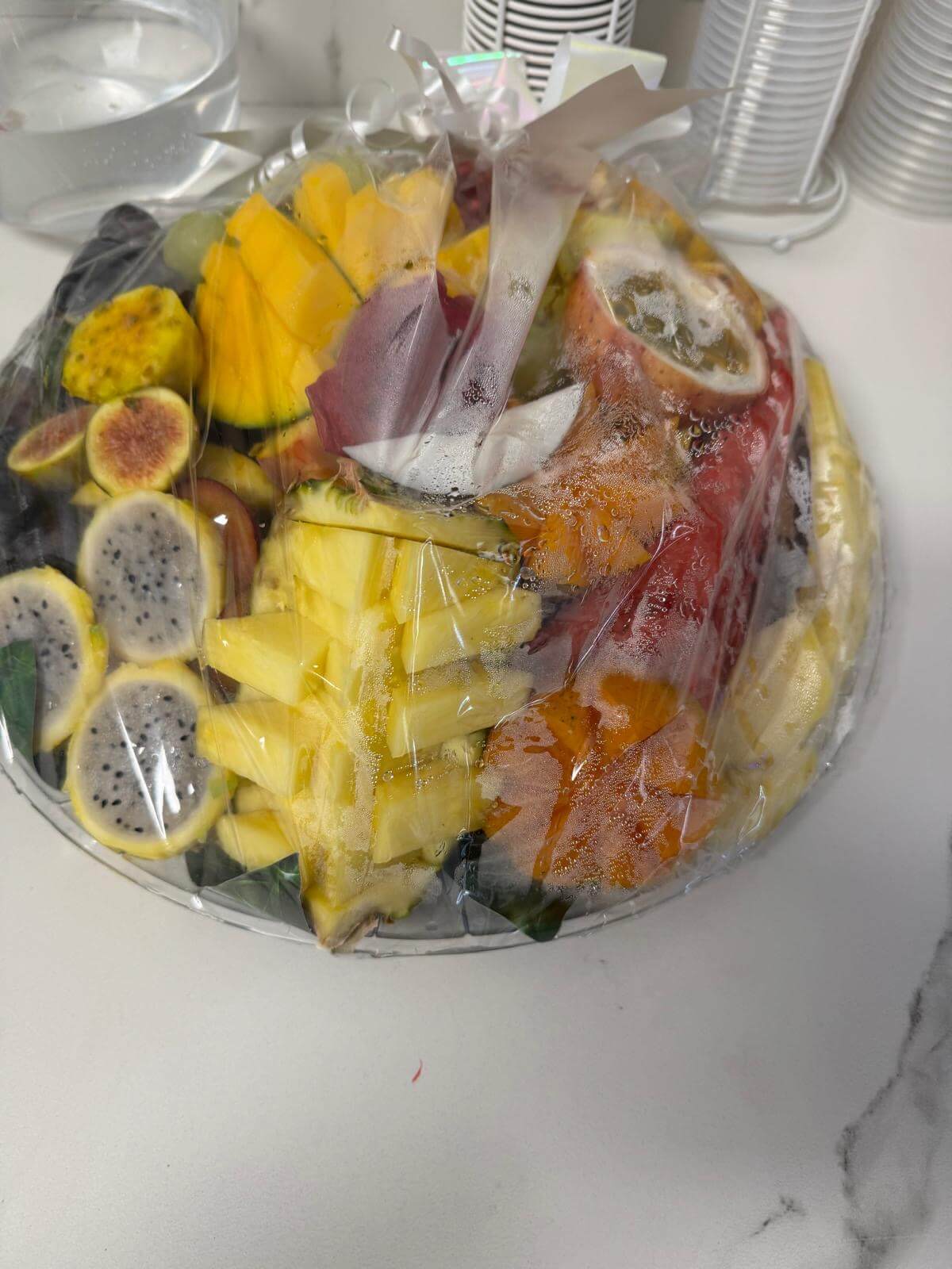 מחית הקוקוס משוכה על מצע הדפים מעליהם נחתכים פירות טריים כגון: אננס, קיווי, מלון, תותים בהתאם לעונה